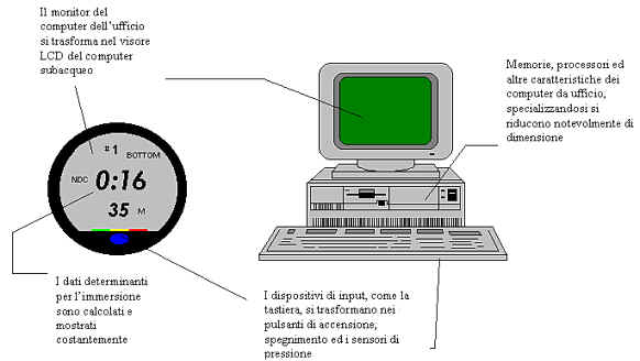 Da un punto di vista logico, i computer subacquei non differiscono di molto dai computer con i quali abbiamo a che fare, sempre più spesso, negli uffici e nelle case: così come i computer tradizionali, anche i computer subacquei sono costituiti, essenzialmente, dagli stessi elementi. Si possono, infatti, distinguere: